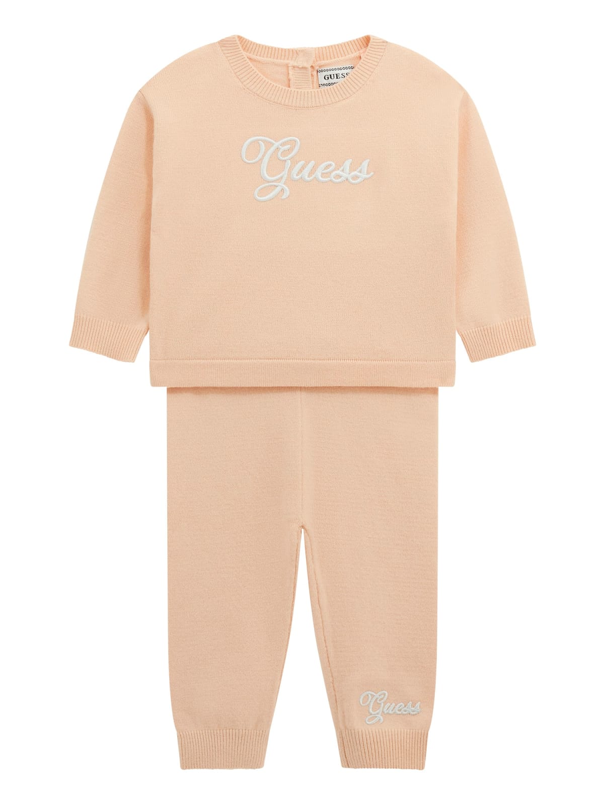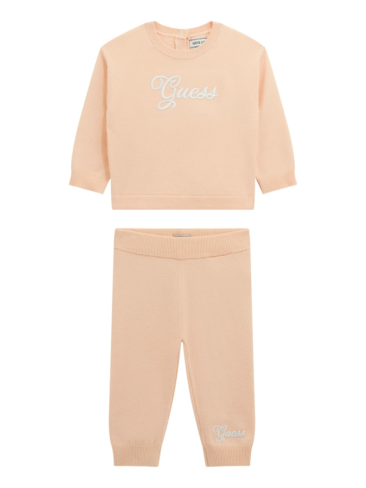 Coordinato in maglia colore cipria, composto da maglioncino e pantalone.