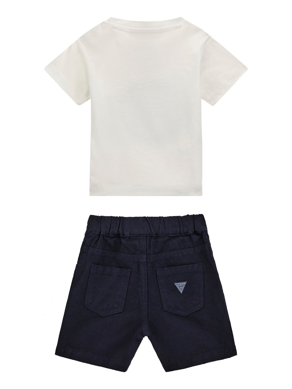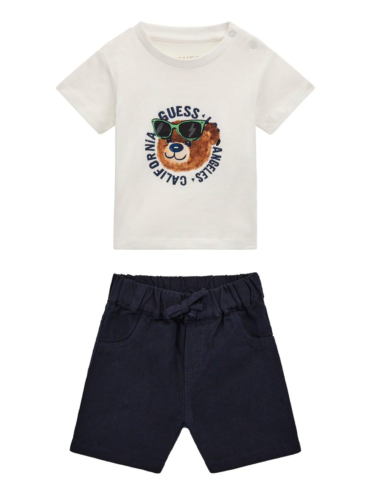 Completino pantaloncino con molla in vita in lino e t shirt in cotone con orsetto