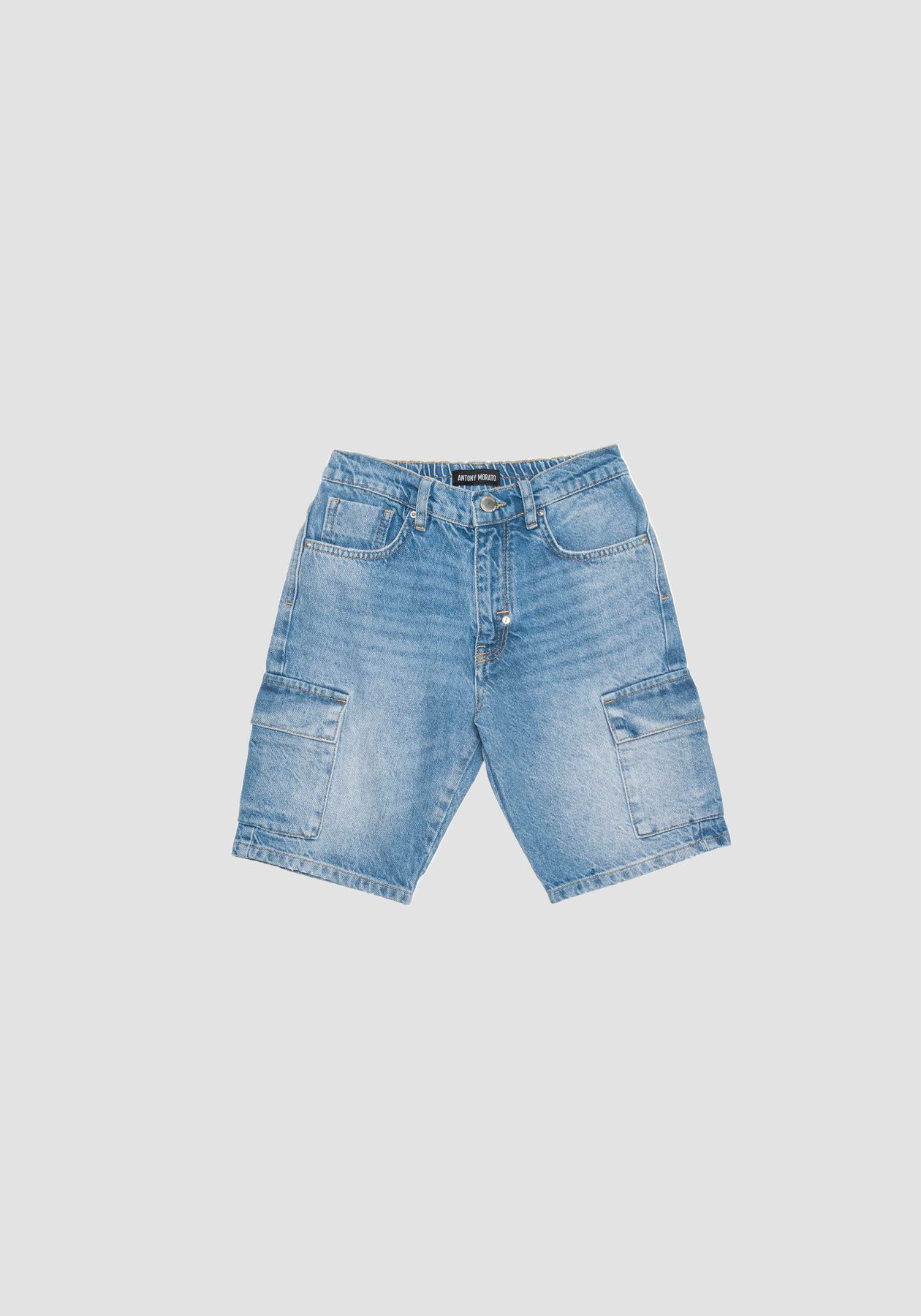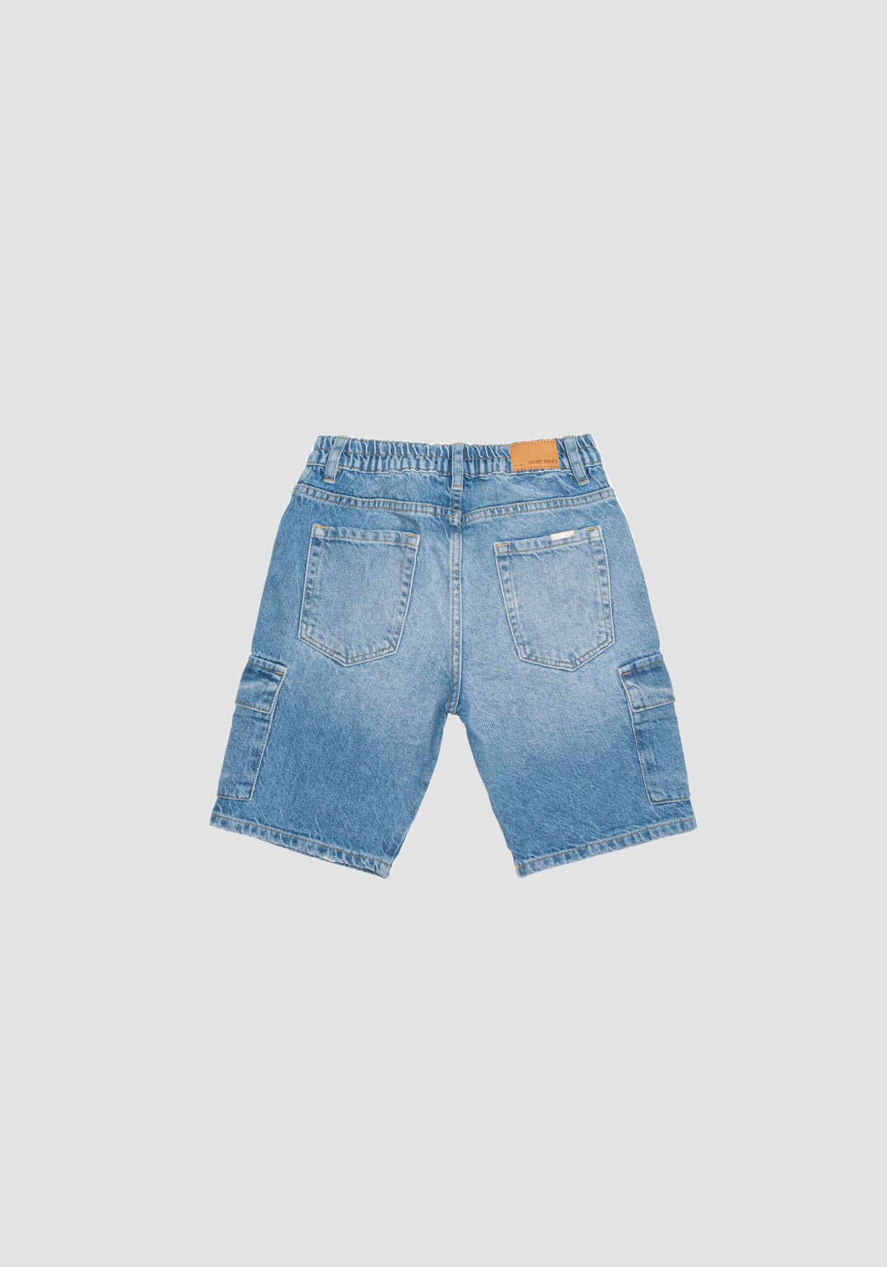 bermuda cargo jeans chiaro con elastico in vita e bottone