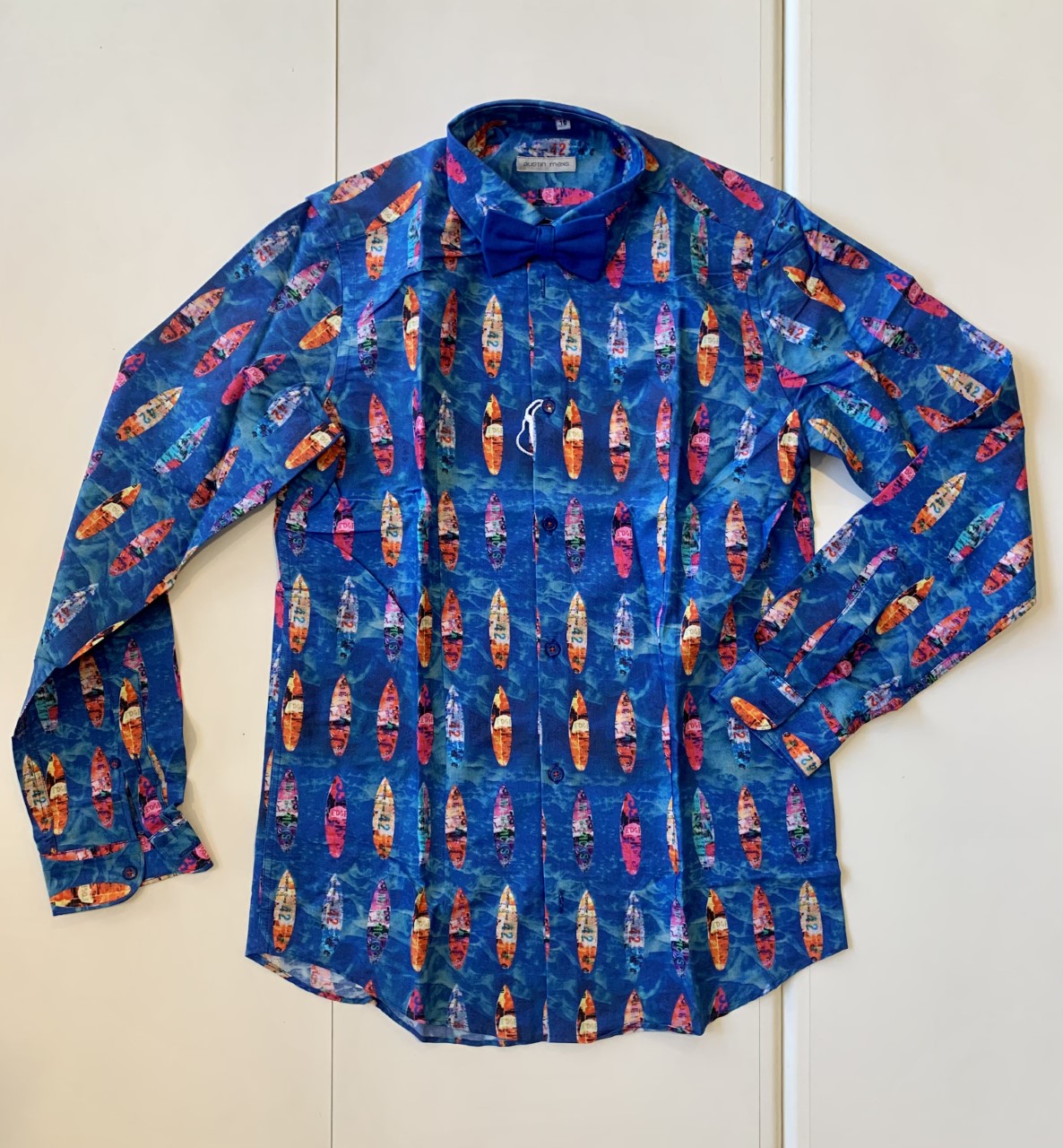 camicia fondo blu con tavole da surf colorate, papillon blu staccabile