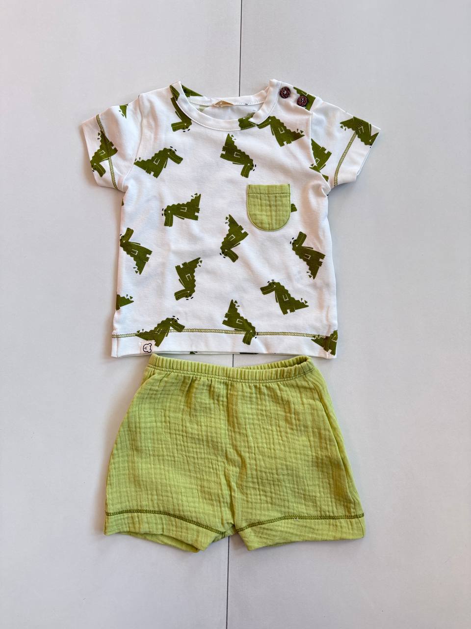 Completino pantaloncino verde con t shirt panna con draghetti disegnati