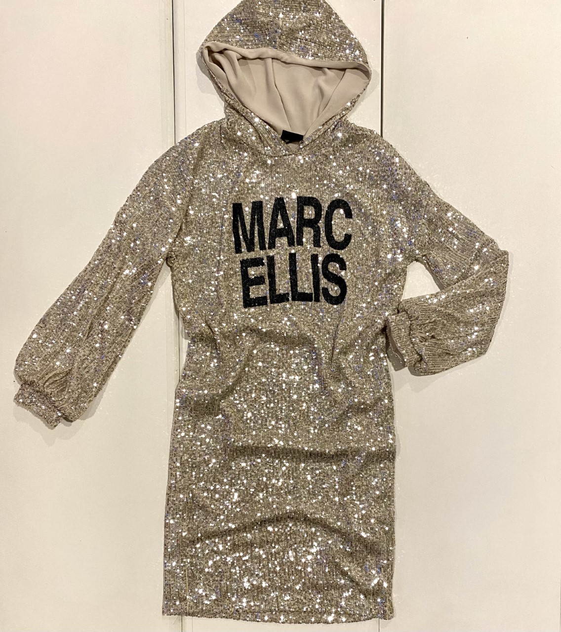 abito con cappuccio, paillettes oro e scritta nera con logo davanti